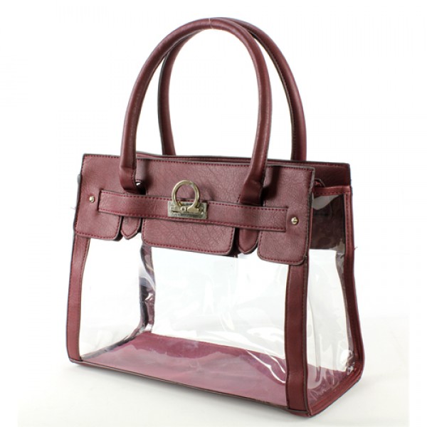Clear PVC Tote - PU Leather Trim Accent w/ Fold Down Lock - Burgundy
