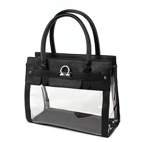 Clear PVC Tote - PU Leather Trim Accent w/ Fold Down Lock - Black
